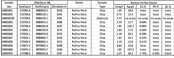 Twelve chip-channel samples were collected from mineralized structures and alteration zones on the Rufina West Mineralized Zone proximal to shallow-surface artisanal workings. A summary of results is presented in Table 1.