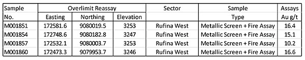 Table 2: Summary of Metallic Screen Re-assays - Rufina West Overlimit Samples