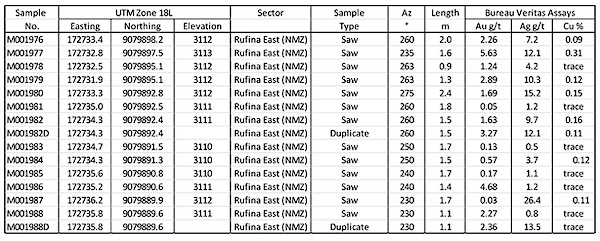 Saw-channels of 0.9 m to 2.0 m, cut at Rufina East, were designed to extend the boundaries of the New Mineralized Zone into hanging wall and footwall argillically altered zones. Results from these channels ranged from 0.03 g/t gold / 26.4 g/t silver / 0.11% copper, to 5.63 g/t gold / 12.1 g/t silver / 0.31% copper.